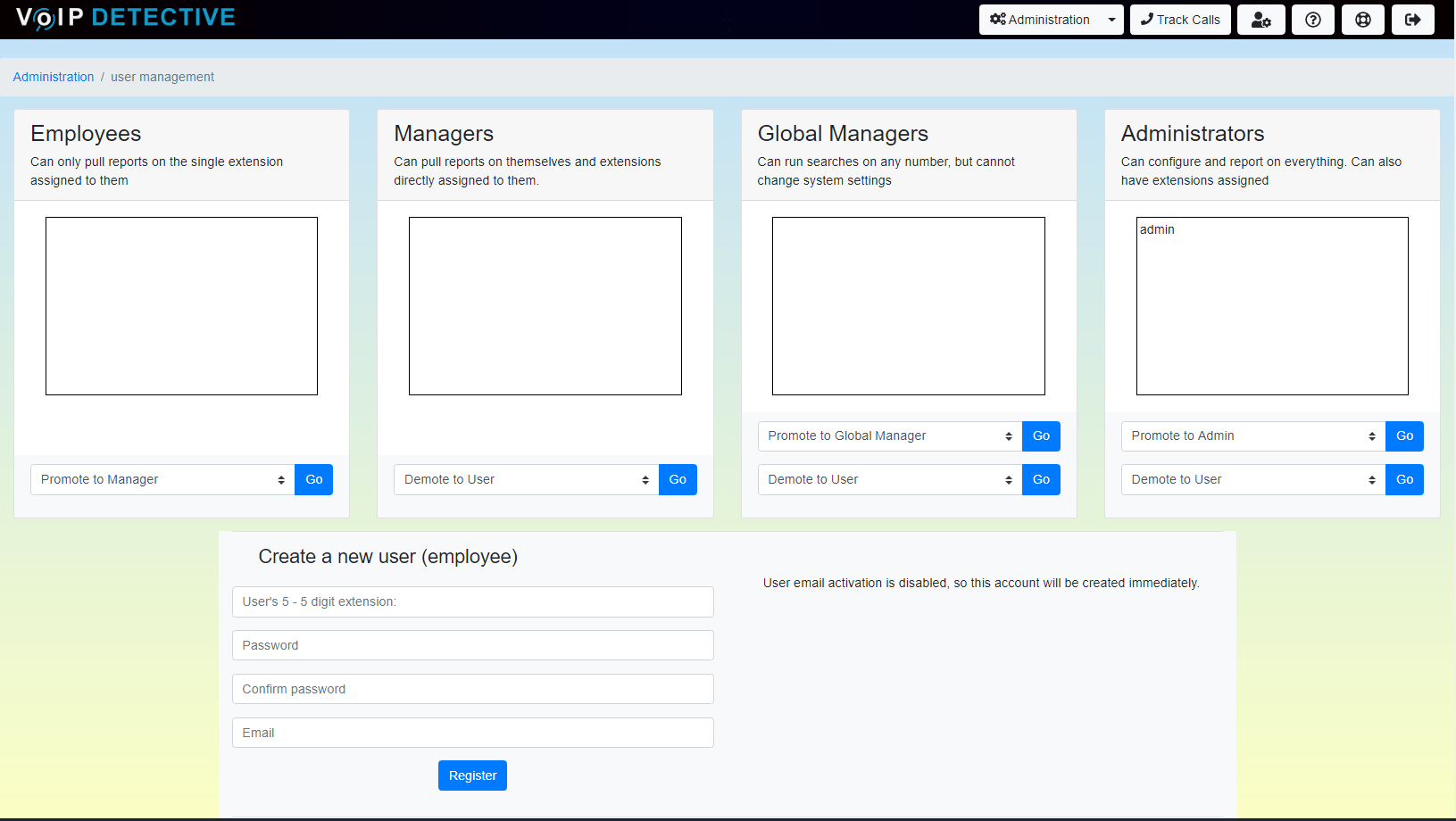 - new – Global managers – These can pull reports on any number, but cannot change the system configuration