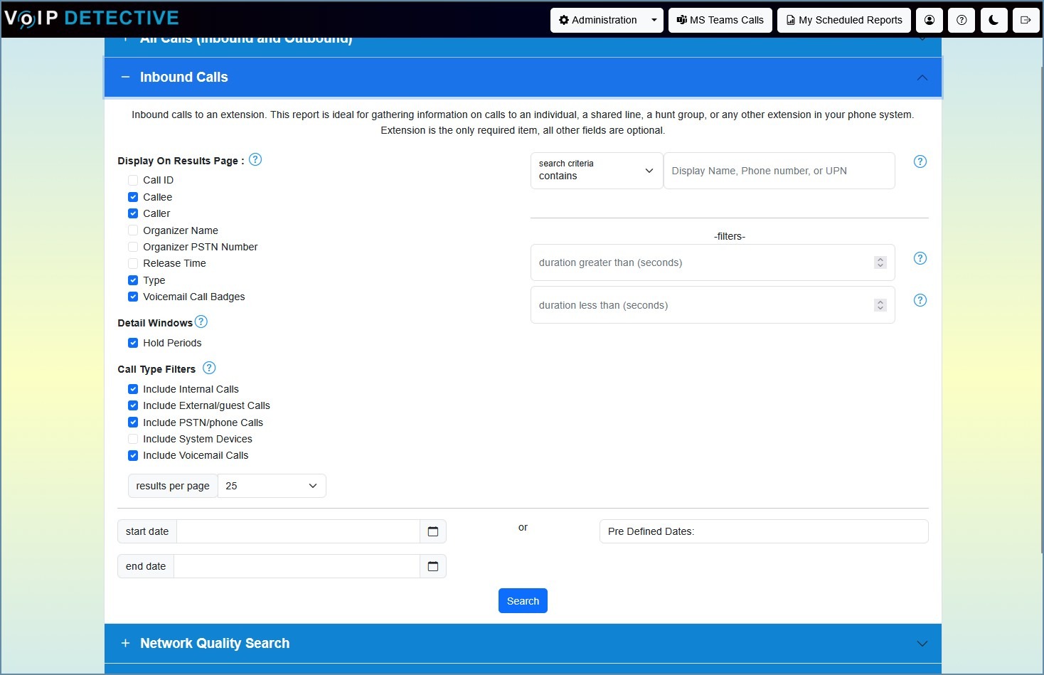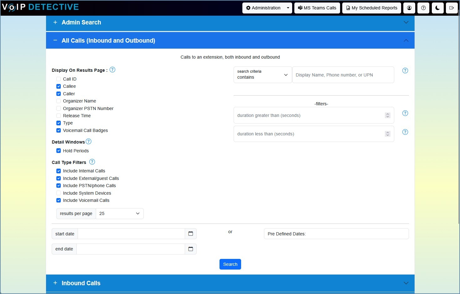 The administrator report is designed to allow the system administrator to search any call across your Microsoft Teams Calling instance without restriction. Standard data is returned, such as calling number, called number, duration, etc, as well as technical information such as the call outcome, rejection reason, and redirection reason. This report can be viewed inside of the VoIP Detective web interface, or exported.