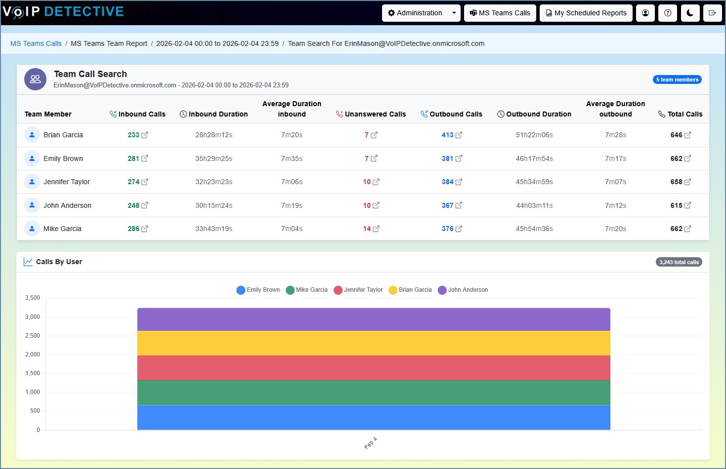 Arguably the most popular report in VoIP Detective, the team report gives a very easy to understand summary of the calls to and from users on your team. This report is designed for a manager to run, so that they have a high level view of those who report to them, along with the ability to drill down further where needed. A team is assigned by the VoIP Detective Administrator, and can include users, call queues, auto attendants – any number that can be reported on in Microsoft Teams.